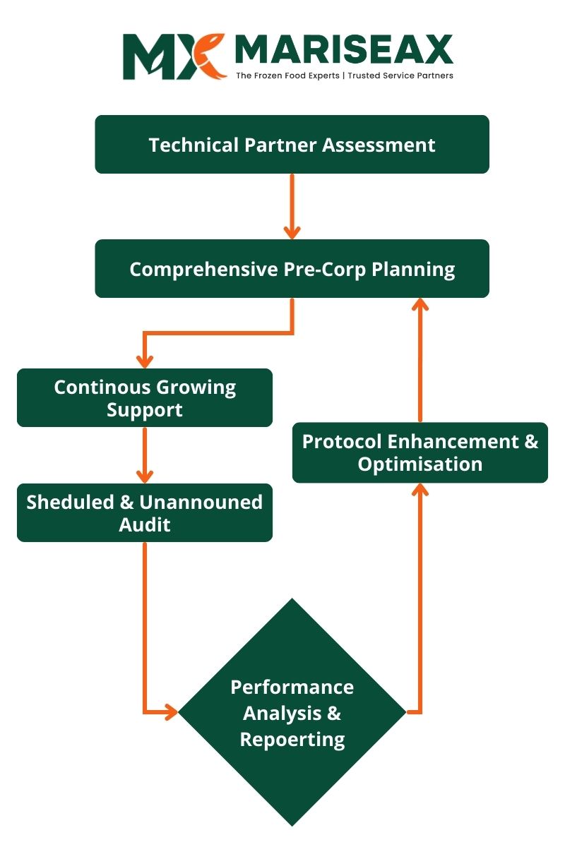 Quality begins at the source. Our comprehensive partnership framework ensures consistent standards through continuous engagement with our farming specialists. This begins with a rigorous cycle of technical management: